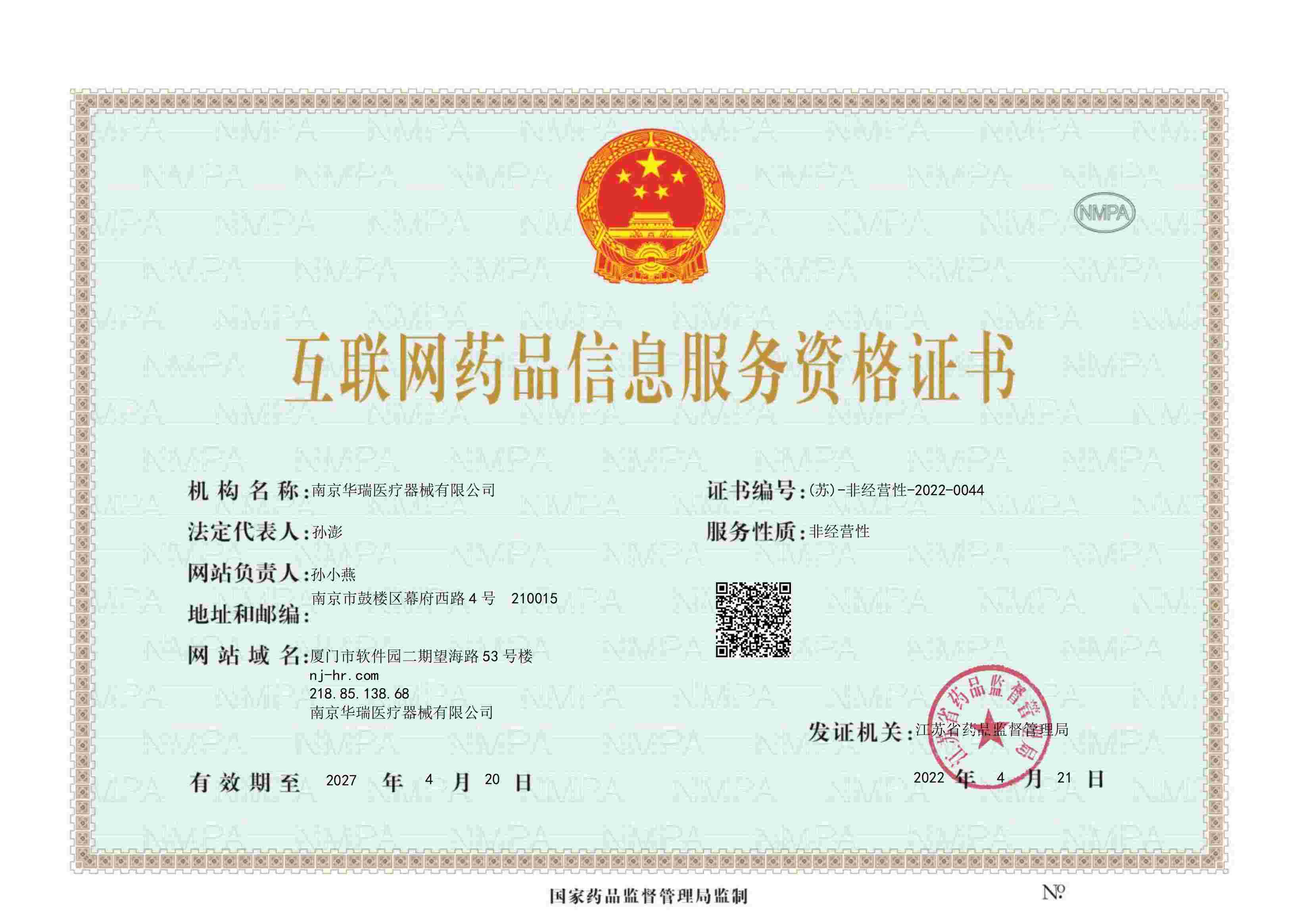 《互聯(lián)網(wǎng)藥品信息服務(wù)資格證書(shū)》(蘇)-非經(jīng)營(yíng)性-2022-0044